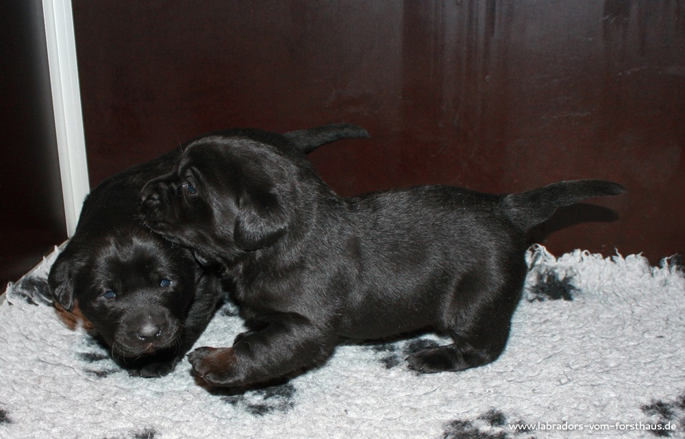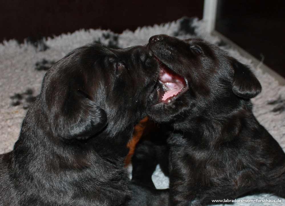 In den ersten zwei Wochen sind die Welpen im Allgemeinen ausschließlich mit Trinken, Verdauen und Schlafen beschäftigt. Dementsprechend sind „Actionfotos“ noch nicht so wirklich möglich. Man kann aber bei genauerem Vergleich sehen, dass die Proportionen sich verändern, der Körper wird im Verhältnis zum Kopf größer und die Beinchen (speziell die Hinterläufe) wandeln sich von kleinen Anhängseln zu immer besser nutzbaren Körperteilen. Zum Ende der zweiten Woche öffnen sich die Augen, wirklich viel sehen tun die Welpen aber noch nicht. Die Augen haben einen deutlichen Blauschimmer, und der Blick ist noch völlig ungerichtet. Im Lauf der dritten Lebenswoche werden die Kleinen dann deutlich munterer. Man stemmt sich immer öfter und besser hoch und wackelt auf allen Vieren durch die Wurfkiste, Geschwister werden bewusst wahrgenommen und die ersten Spielkontakte sind zu beobachten – die Welt wird größer!