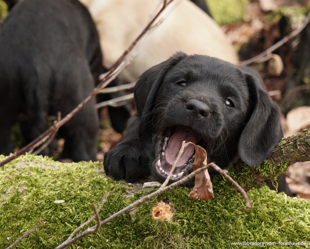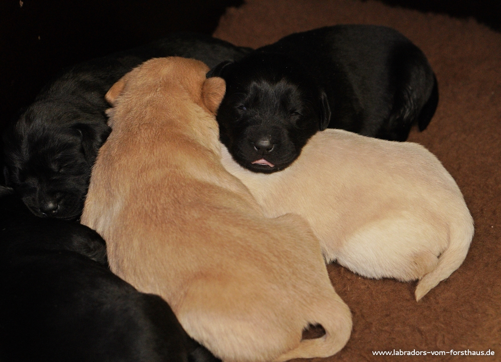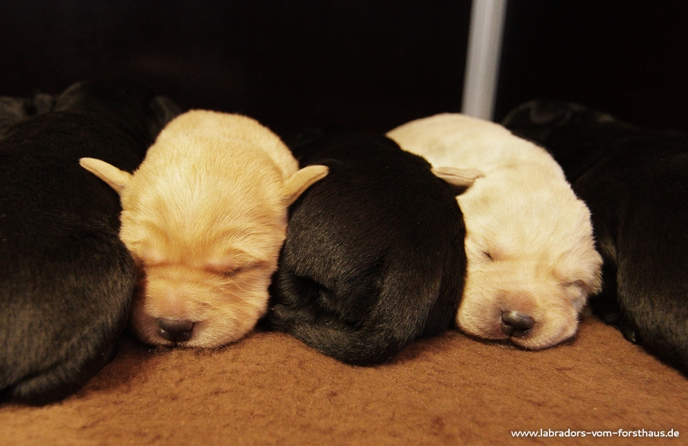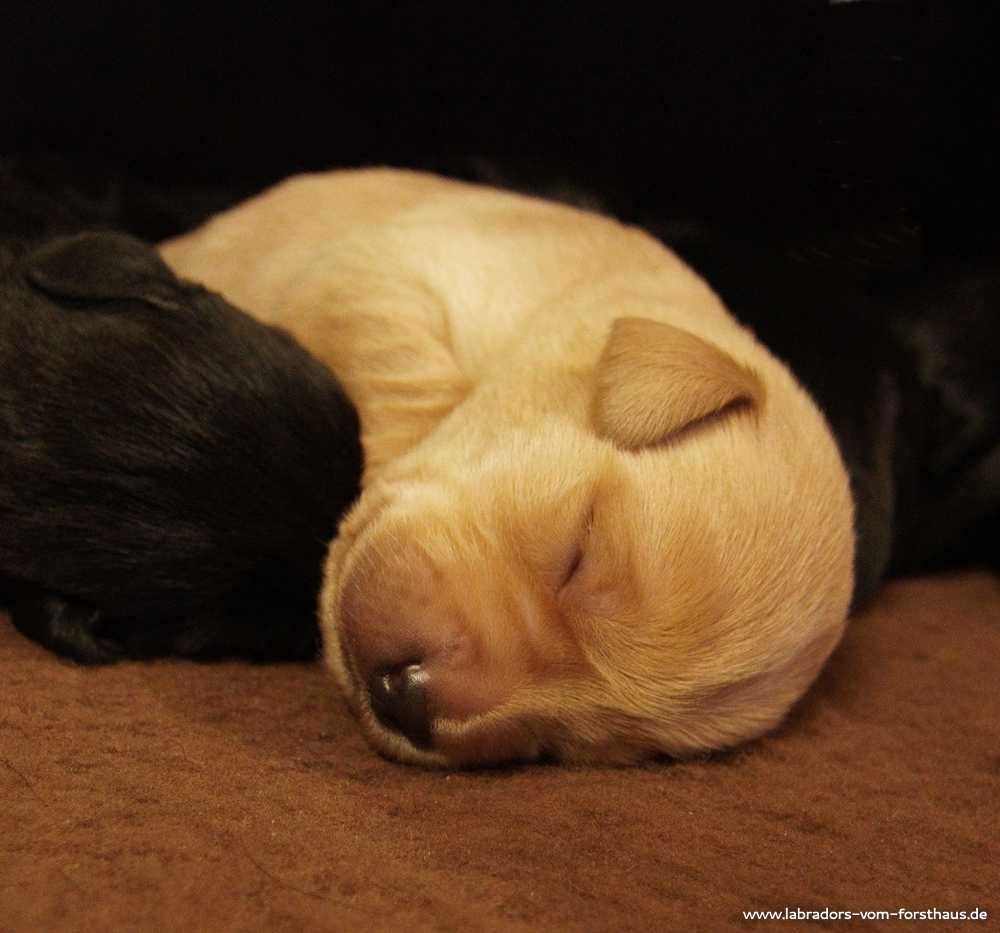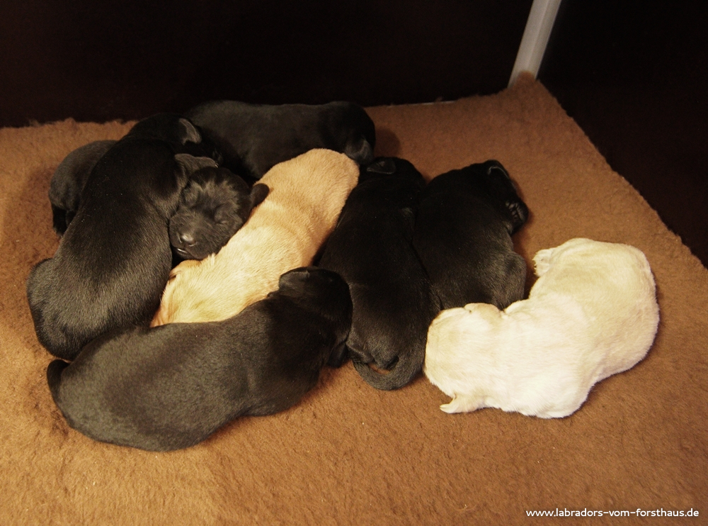 Am 30.01.2021 hat Heli ihren ersten Wurf zur Welt gebracht: einen gelben und einen schwarzen Rüden, eine gelbe und fünf schwarze Hündinnen. Die junge Mutter hat alles souverän gemeistert und kümmert sich sehr gut um ihren Nachwuchs. Alle Welpen sind vom Gewicht her ziemlich ausgewogen (durchschnittlich ca. 390 Gramm) und machen einen ausgesprochen munteren und agilen Eindruck.