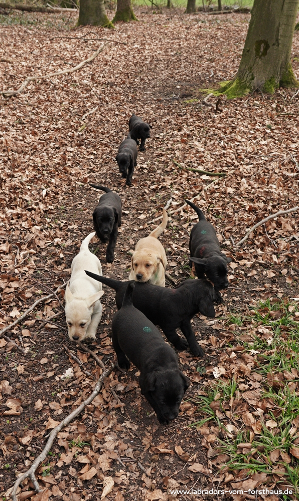 Da wir relativ abgelegen und fast mitten im Wald wohnen, liegt es nahe, mit der ganzen Bande Streifzüge durch die nähere Umgebung zu unternehmen. Diese Waldspaziergänge sind nach kurzer Zeit sehr beliebt, weil es dort immer viel zu entdecken gibt. Außerdem lernen die Welpen so schnell, sich an uns zu orientieren, uns zu folgen und auf ein Signal hin zu uns zu kommen – natürlich gibt es dann auch Leckerchen zur Belohnung!
