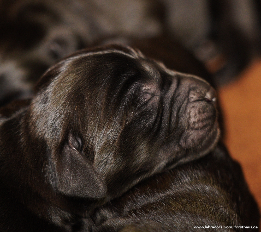 In der ersten Woche besteht ein Welpenleben hauptsächlich aus schlafen, trinken und verdauen. Man liegt warm und gemütlich mit den Geschwistern zusammen bei der Mutter und nimmt täglich ein wenig zu.