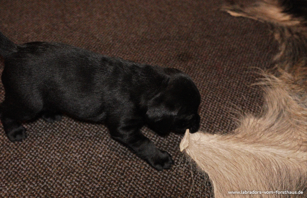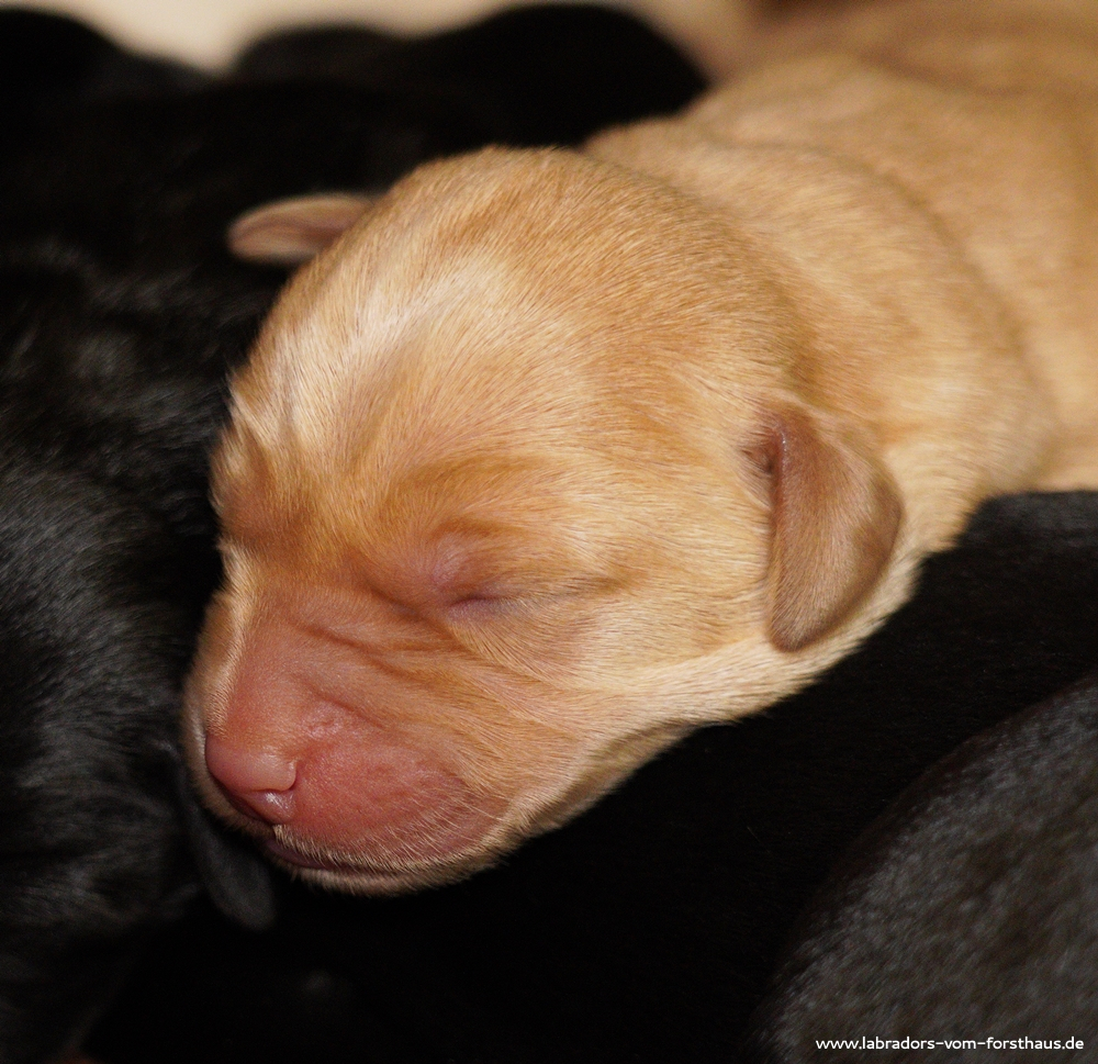 Am 30.01.2021 hat Heli ihren ersten Wurf zur Welt gebracht: einen gelben und einen schwarzen Rüden, eine gelbe und fünf schwarze Hündinnen. Die junge Mutter hat alles souverän gemeistert und kümmert sich sehr gut um ihren Nachwuchs. Alle Welpen sind vom Gewicht her ziemlich ausgewogen (durchschnittlich ca. 390 Gramm) und machen einen ausgesprochen munteren und agilen Eindruck.