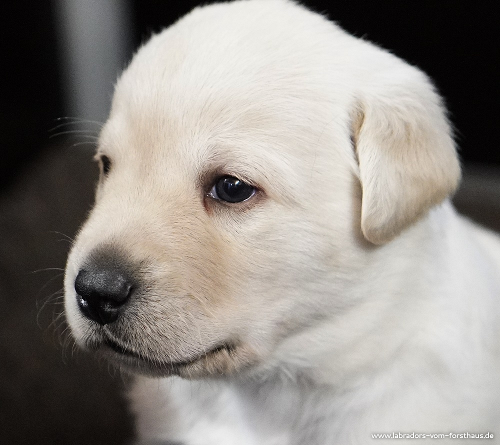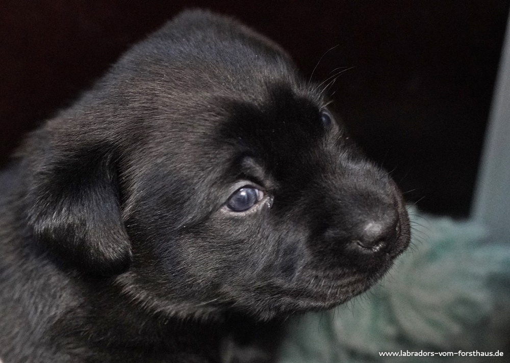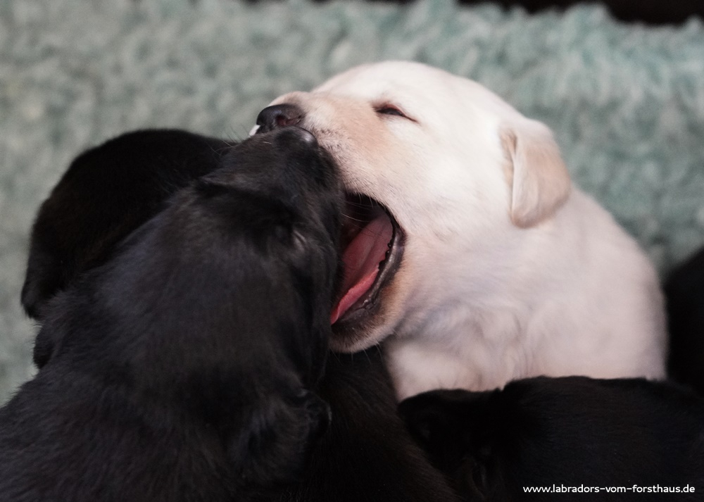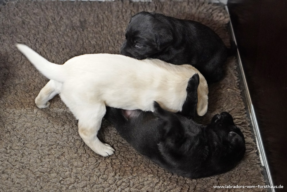 Jetzt setzt eine rasante Entwicklung der Körperbeherrschung und der Wahrnehmungsfähigkeiten ein! Die Welpen können sich immer besser orientieren, sie nehmen ihre Geschwister bewusst wahr und beginnen miteinander zu spielen und zu streiten, was mitunter recht lautstark ausfällt! Die Augen haben noch das „babyblau“ und sind noch etwas „blicklos“, das ändert sich aber im Verlauf der nächsten Tage.