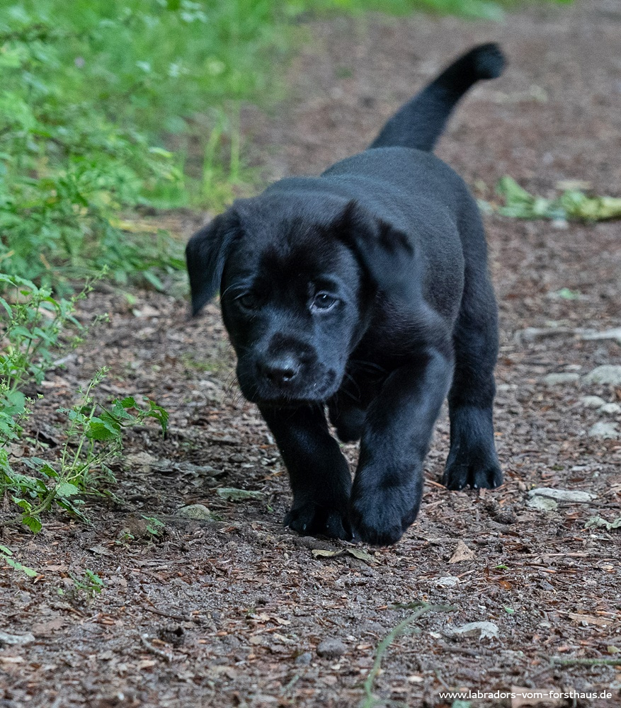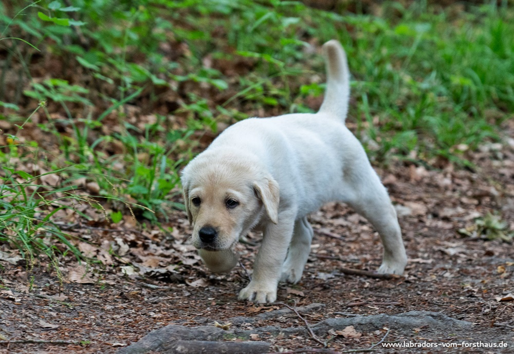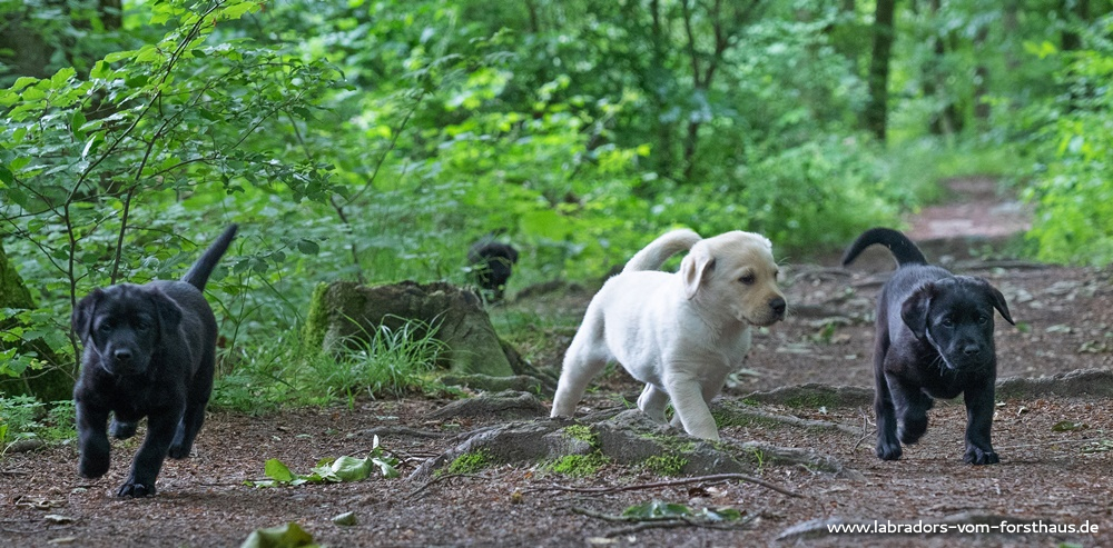 Jetzt kommt die Zeit der vielfachen Umwelterfahrungen! Man lernt das Autofahren kennen, unternimmt Ausflüge auf den Hundeübungsplatz und zum Tierarzt, und auch zuhause gibt es Veränderungen: Im Welpenauslauf finden sich neue Klettermöglichkeiten und optische wie auch akustische Reize, und wir unternehmen Spaziergänge in den Wald, der unser Grundstück umgibt. Dort ist es immer interessant, und gleichzeitig lernen die Welpen, auf uns zu achten und uns zu folgen.