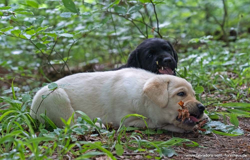 Das „Ausflugsprogramm“ wird weiter ausgebaut und man lernt auch das nahe gelegene Revier nebst Wasser in Form von Bächen und Teichen kennen. Gleichzeitig entwickeln sich die mentalen und körperlichen Fähigkeiten der Welpen immer mehr, und man kann absehen, dass bald jeder kleine Hund individuell gefördert und mit den Gegebenheiten seines zukünftigen Lebens vertraut gemacht werden muss – eine Aufgabe, die der Züchter nicht mehr allein für einen ganzen Wurf bewältigen kann. Deshalb ist es gut und richtig, dass die Welpen dann ihre „eigenen“ Familien bekommen, die diese wichtige Aufgabe übernehmen!