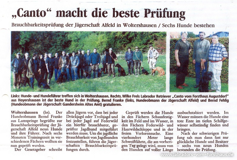 Aska vom Forsthaus Augustdorf mit Ernst Führing hat bei der Dummyprüfung in Berkhof den ersten Platz mit dem Prädikat "vorzüglich" belegt.
